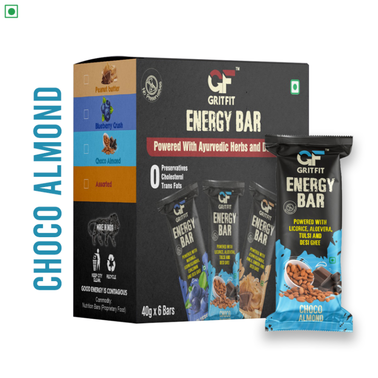 Introducing our GritFit Energy Bar in the delectable Choco Almond variant – a burst of pure, natural energy in every mouthwatering bite! Experience the invigorating combination of Choco Almond with our meticulously crafted energy bar that not only nourishes your body but also delights your taste buds. Made with a thoughtful blend of ingredients including Jumbo Oats, Instant Oats, Oats Flour, Honey, Desi Ghee, Wheat Flakes, Rice Crispies, Almonds, Dark Chocolate Compound, Peanut Butter, Pearl Millet, Date Paste, Soy Protein Isolate, Green Pumpkin Seeds, Liquid Glucose, Brown Rice Syrup, Vegetable Glycerine, Ashwagandha, Amla, Ginger, Soy Lecithin, and Rosemary for freshness. This energy-packed bar is a perfect balance of nutrition and flavor to fuel your active lifestyle.