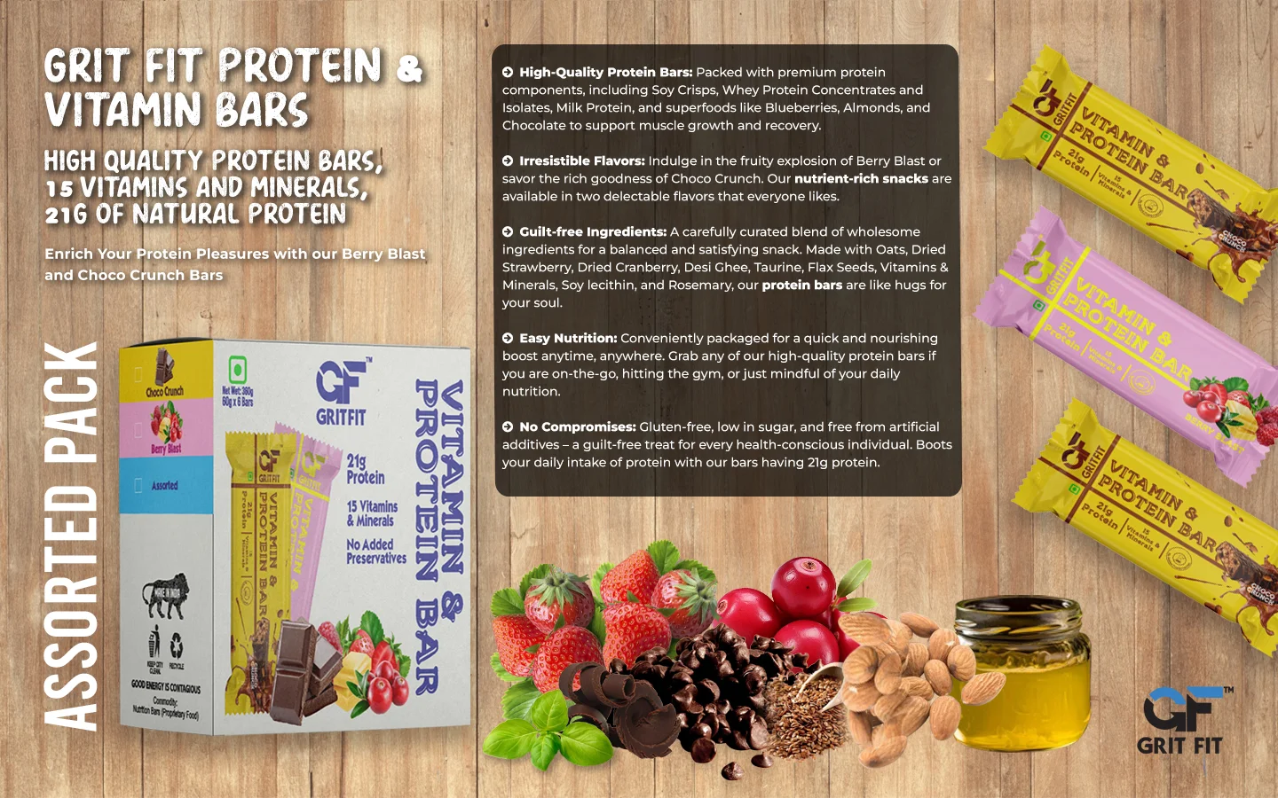 Experience the ultimate combination of taste and nutrition with our GRITFIT Vitamin & Protein Bar Pack. Specially crafted to fuel your active lifestyle, this assorted pack features 6 protein bars in 3 delightful flavors, ensuring a diverse and delicious experience.