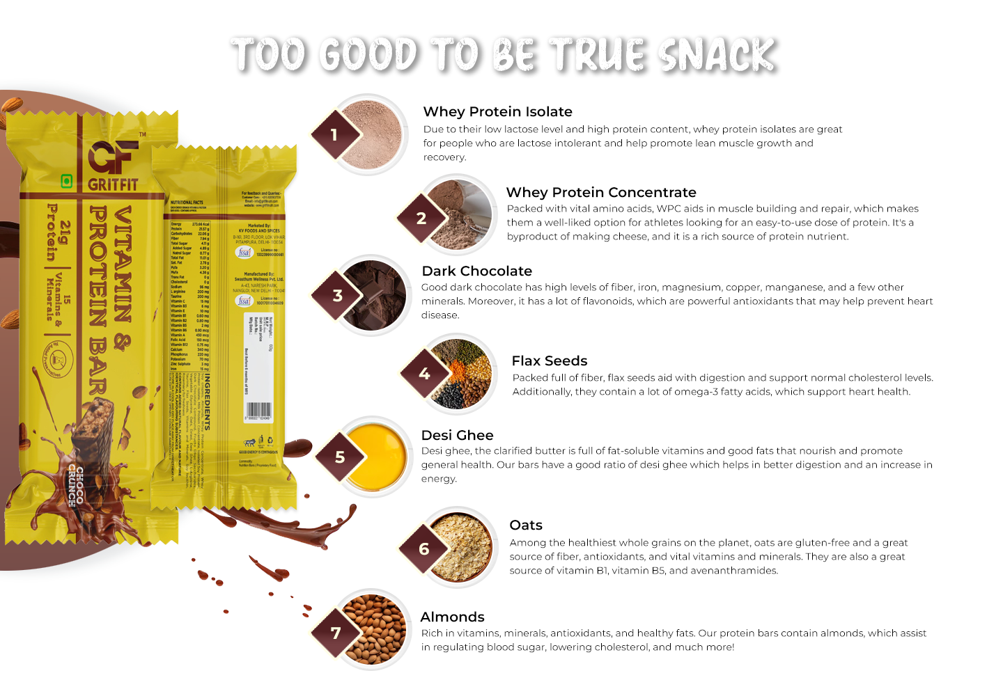 Experience the delectable fusion of flavor and nutrition with the GRITFIT Choco Crunch Vitamin & Protein Bar. This single pack is specially crafted to enhance your snacking moments, offering a harmonious blend of taste and health benefits. Immerse yourself in a meticulously designed bar that not only gratifies your cravings but also provides essential nourishment for your body. Featuring a rich combination of Soy crispies, Almonds, Whey Protein Concentrate, Whey Protein Isolate, Milk Protein Concentrate, Isolated Soy Protein, Dark Chocolate Compound, Fructo Oligo Saccharides, Vegetable Glycerine, Oats, Dried, Desi Ghee, L-Arginine, Taurine, Flax Seeds, Vitamins and Minerals, Soy lecithin, and Rosemary for freshness, each bar is a nutrient-packed delight. Elevate your snacking experience with this thoughtfully curated composition that caters to both your taste buds and your well-being.